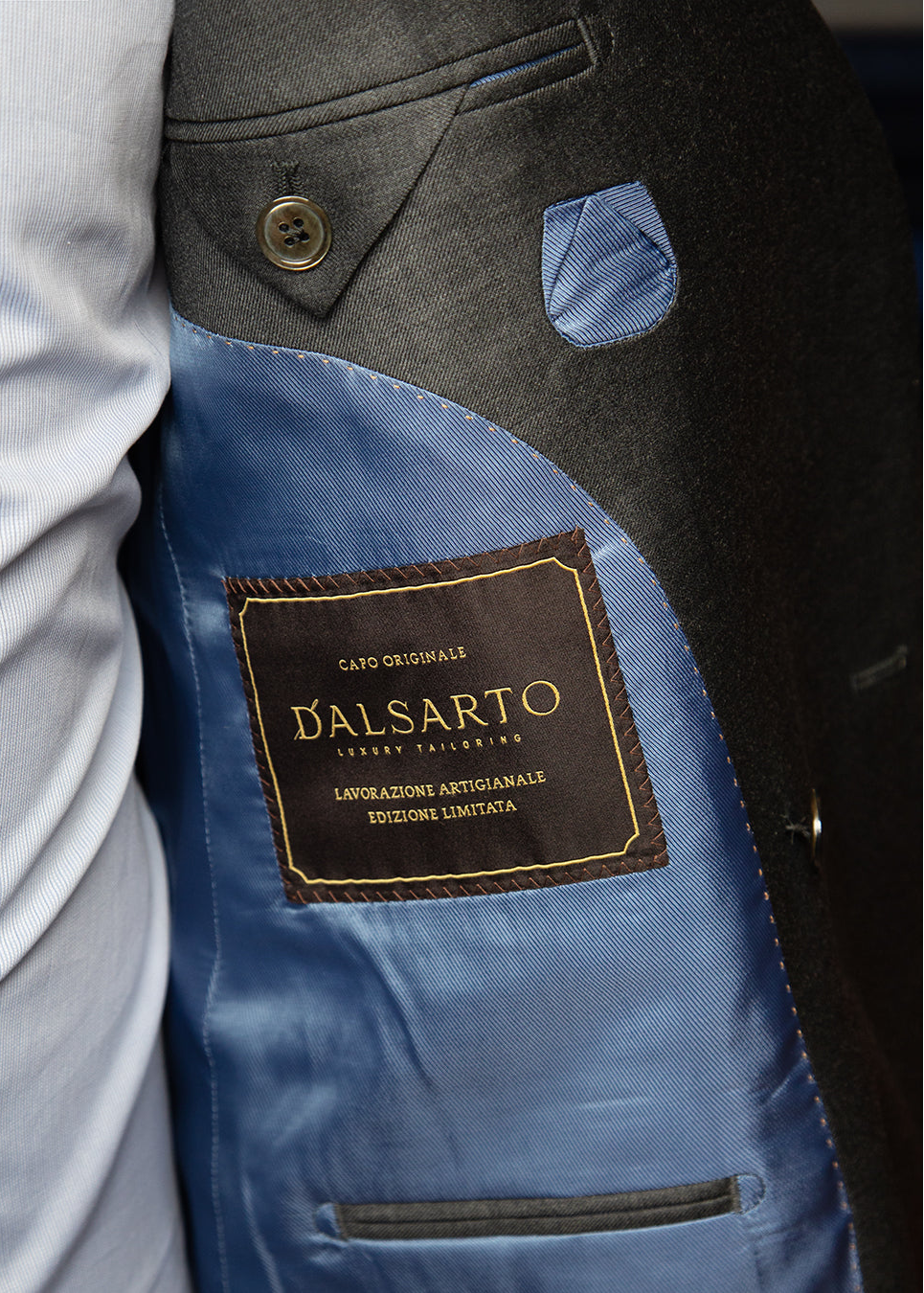 Ogni Giacca Su Misura Dalsarto viene realizzata ricamando internamente il nome del Cliente. Sulla base del tessuto selezionato per il capo, il nome viene ricamato in colore oro in un elegante carattere corsivo.